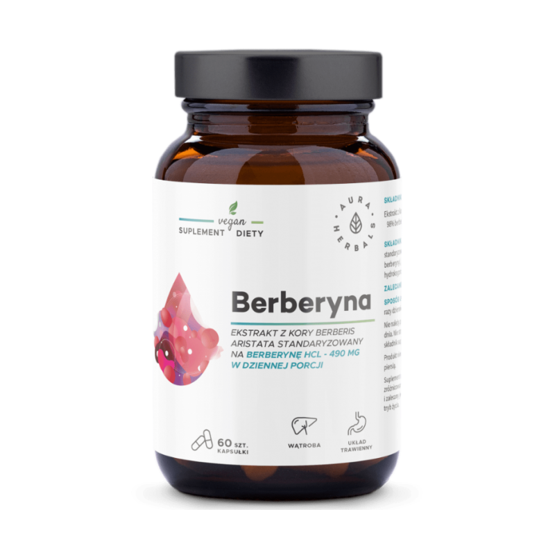 Produkt Berberyna 500 mg marki Aura Herbal to wysokiej jakości suplement diety zawierający ekstrakt z Berberis aristata standaryzowany na zawartość berberyny. Jest to wegański produkt, co oznacza, że nie zawiera składników pochodzenia zwierzęcego.