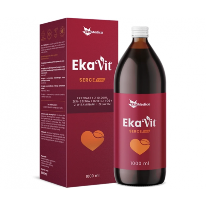 EkaVit Serce Plus to płynny suplement diety marki EkaMedica, stworzony w celu wsparcia zdrowia serca oraz ogólnego dobrej kondycji organizmu. Produkt został opracowany na bazie starannie dobranych składników, w tym ekstraktu z kwiatów głogu, żeń-szenia, witamin i żelaza, które zostały wkomponowane w naturalne soki owocowe. Całość jest pasteryzowana, co zapewnia zachowanie pełni wartości odżywczych.