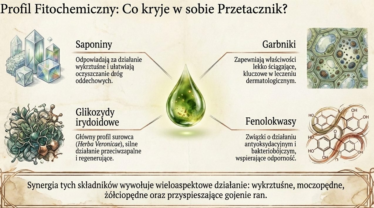 Wysoka wartość przetacznika leśnego wynika z bogactwa zawartych w nim substancji czynnych. Do najważniejszych składników, które decydują o jego profilu biologicznym, należą: