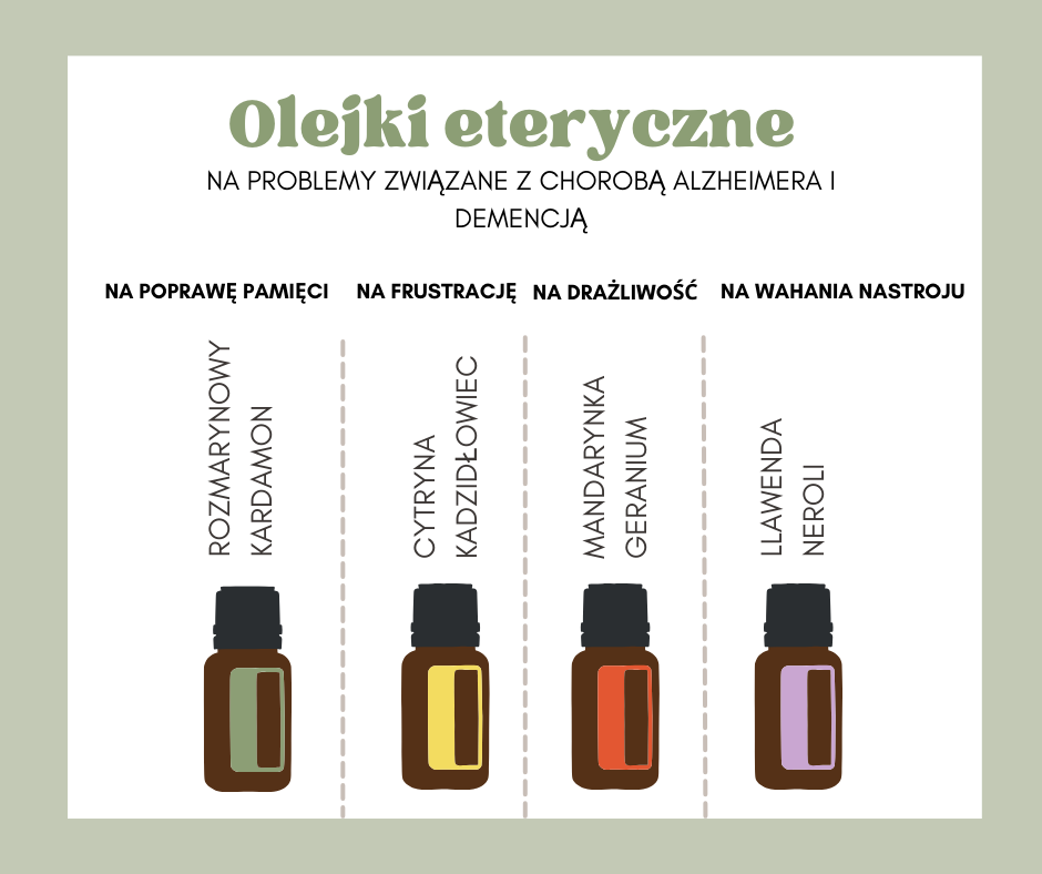 Olejki eteryczne są stosowane w aromaterapii jako naturalne środki wspomagające zdrowie i dobre samopoczucie. W kontekście leczenia Alzheimera i demencji, aromaterapia z użyciem olejków eterycznych może pomóc w łagodzeniu niektórych objawów, takich jak lęk, frustracja, pamięć, depresja, problemy ze snem czy dezorientacja. Chociaż nie zastępują one tradycyjnych metod leczenia, mogą być cennym uzupełnieniem terapii.