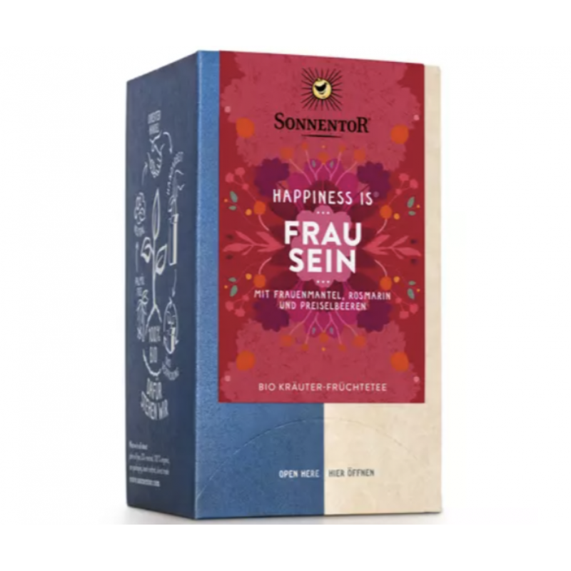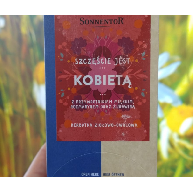 Herbata "Szczęście jest kobietą" marki Sonnentor to połączenie wyjątkowych składników ekologicznych, które tworzą niezwykłe doznania smakowe i aromatyczne. Składniki tej herbacianej mieszanki to: przywrotnik pospolity (30%), rozmaryn (20%), melisa, żurawina (12%), bylica, rumianek oraz nagietek.
