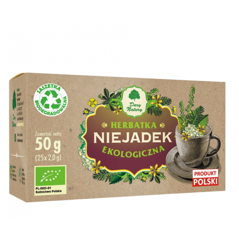 Herbatka "Niejadek" jest produktem pochodzącym z rolnictwa ekologicznego, co oznacza, że składniki zostały uprawiane i pozyskane z poszanowaniem naturalnych metod i bez użycia sztucznych substancji chemicznych.