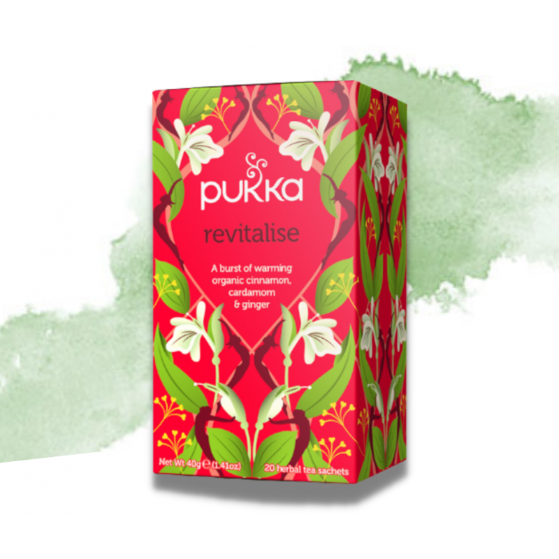 PUKKA Herbata Revitalise to połączenie aromatycznego kardamonu, cynamonu, goździków, czarnego bzu, imbiru i zielonej herbaty zamkniętych w 20 saszetkach do zaparzania. Ta pyszna mieszanka pobudzi twoje zmysły!