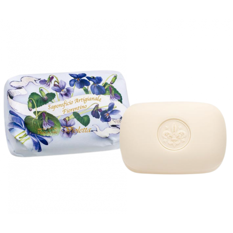 Odkryj urok i delikatność z mydłem Violetta od Saponificio Artigianale Fiorentino. To 100% roślinne mydło ręcznie wyrabiane, o subtelnej i delikatnej nucie zapachowej fiołka, to esencja łagodności i elegancji. Zapach fiołka otula delikatną mgiełką, przynosząc słodkie emocje i przyjemność każdego dnia.