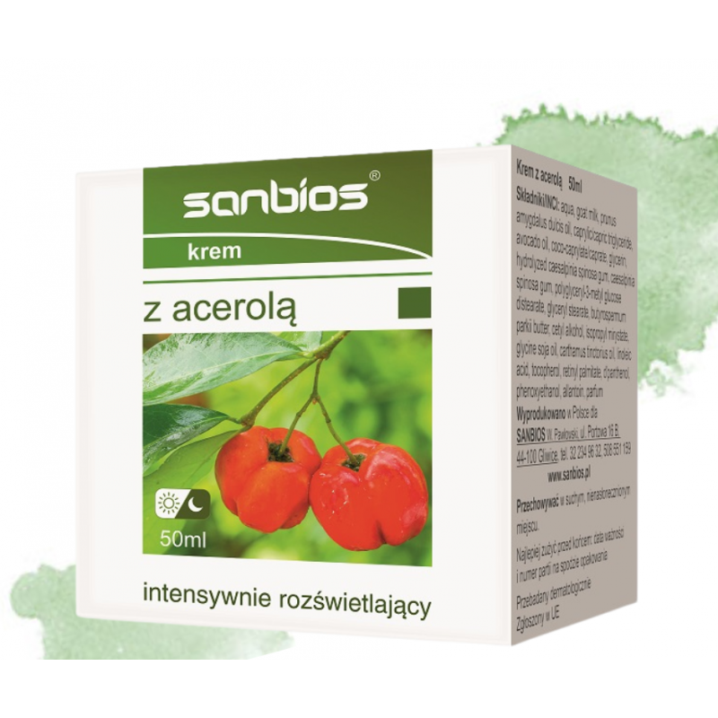 Krem z acerolą firmy Sanbios nadaje się do każdego rodzaju skóry. Kosmetyk ma na celu odżywić, ochronić i intensywnie rozświetlić skórę. Acerola to źródło witaminy C, która stymuluje odbudowę kolagenu co wpływa na ujędrnienie skóry. Hamuje również jej fotostarzenie. Ponadto reguluje złuszczanie się naskórka, długotrwale odżywia, nawilża, ujędrnia i rozświetla skórę.