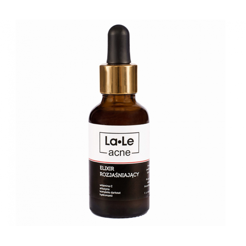 Eliksir rozjaśniający marki LA-LE jest przeznaczony do stosowania na skórę, zwłaszcza w celu rozjaśnienia przebarwień i poprawy kolorytu. Produkt jest pakowany w szklaną butelkę z pipetą o pojemności 30 ml.