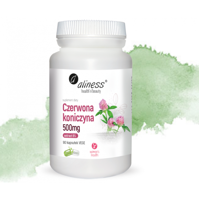 Suplement diety firmy Aliness Czerwona Koniczyna to preparat w postaci kapsułek Vege, zawierający 500 mg ekstraktu z koniczyny czerwonej o stężeniu 8%.