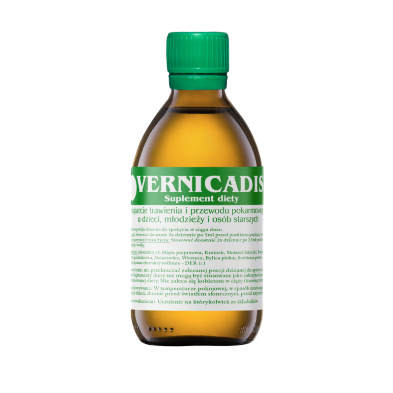 VERNICADIS® to flagowy produkt z serii suplementów diety, stworzony na podstawie tradycyjnej receptury. Jego starannie skomponowana formuła bazuje na naturalnych wyciągach z ziół, które są znane ze swoich właściwości oczyszczających. Suplement ten wspiera naturalne procesy detoksykacji organizmu oraz wzmacnia odporność układu pokarmowego, chroniąc go przed szkodliwymi czynnikami.