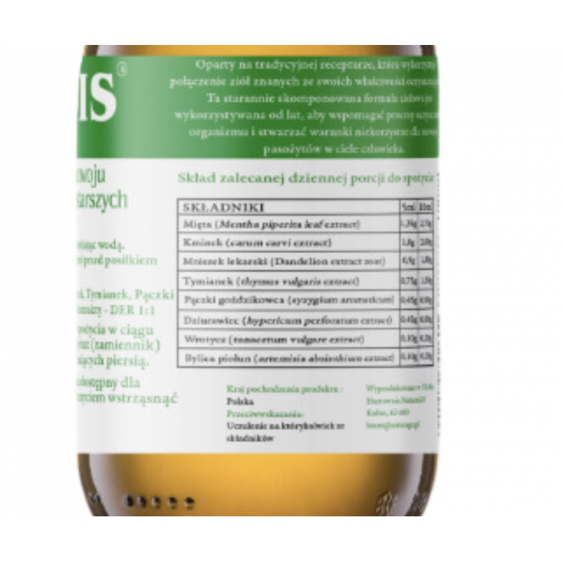 (ekstrakty z): Mięta pieprzowa, Mniszek lekarski, Kminek, Tymianek, Pączki goździkowca, Dziurawiec, Wrotycz, Bylica piołun, sorbinian potasu. Wykorzystane ekstrakty – DER 1:1