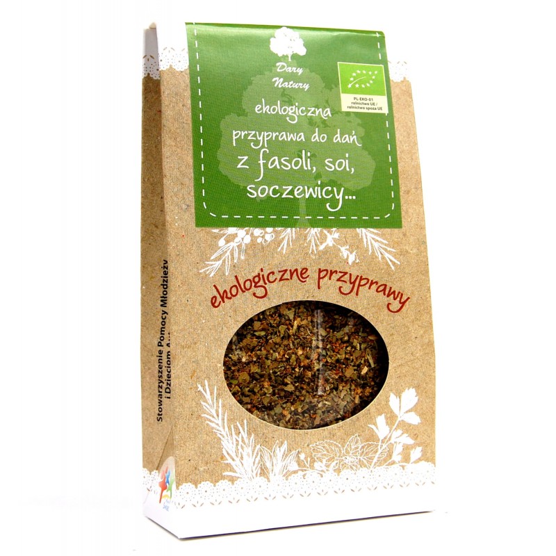 Przyprawa do dań z fasoli, soi, soczewicy eko 30g marki Dary Natury to starannie dobrane zioła i przyprawy, które nadają potrawom wspaniały smak i aromat. Zalecana jest do ciężkostrawnych dań z nasion strączkowych, a jej dodawanie powinno następować pod koniec gotowania.