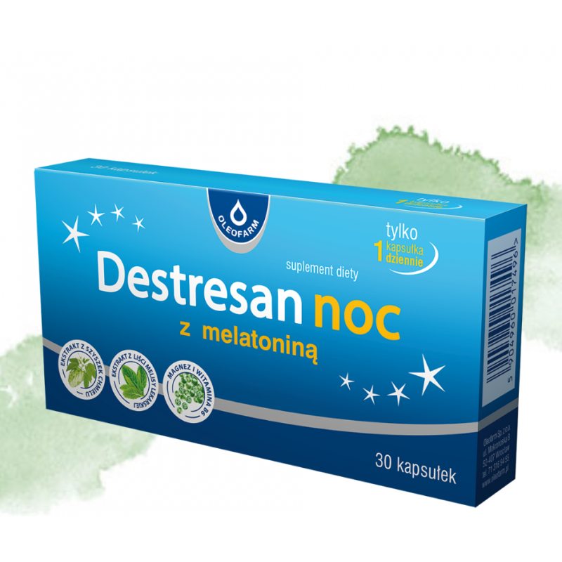 Preparat DESTRESAN NOC z melatoniną firmy Oleofarm jest suplementem diety, który został opracowany specjalnie dla osób dorosłych mających trudności z zasypianiem, podróżujących z zmianą strefy czasowej oraz pracujących w systemie zmianowym.