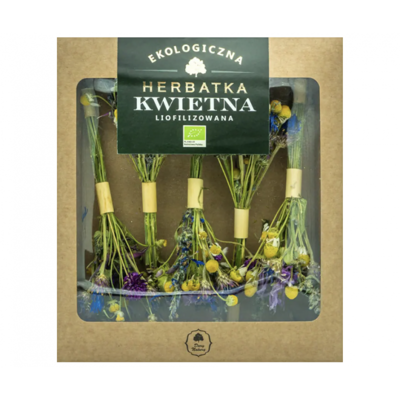Bardzo efektowanie wyglądająca herbata- cudownie nadaje się na prezent. W jej skład wchodzi 5 ręcznie robionych ekologicznych bukiecików z kwiatów liofilizowanych.