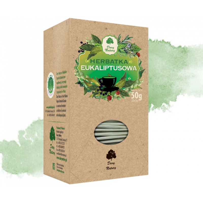 Herbata eukaliptusowa w torebkach do zaparzania. Mieszanka liści eukaliptusa, owocu maliny, owocu bzu czarnego, ziela tymianku i tawuły. Zioła eukaliptusa, tymianku i tawuły zawarte w herbacie wspierają zdrowie układu oddechowego, a owoce czarnego bzu i maliny działają korzystnie na odporność organizmu.