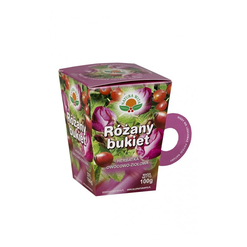 Herbatka ziołowo-owocowa "Różany bukiet" marki Natura Wita 100g to piękna i aromatyczna mieszanka suszonych kwiatów i owoców, która zapewnia delikatny i kwiatowy smak. Ta herbata jest doskonałym wyborem dla miłośników różanego aromatu i chwili relaksu.