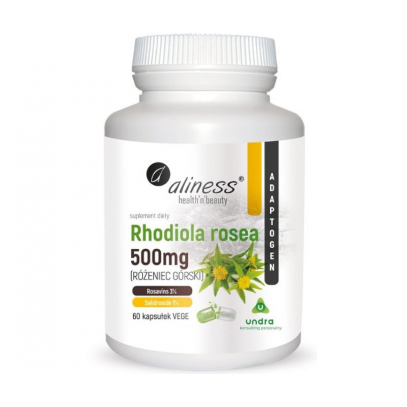 Rhodiola rosea 500mg to suplement diety marki Aliness, dostępny w formie 60 kapsułek VEGE. Głównym składnikiem preparatu jest wysokiej jakości ekstrakt z różeńca górskiego (Rhodiola rosea), który został poddany podwójnej standaryzacji na 3% rozawin i 1% salidrozydu.