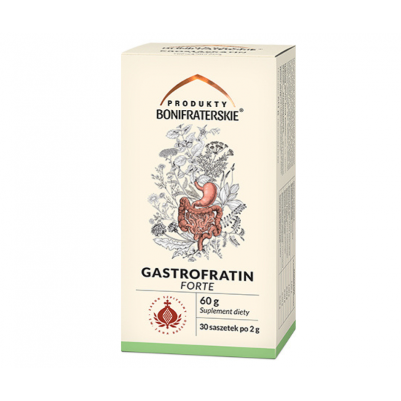 GASTROFRATIN FORTE to suplement diety w formie mieszanki ziołowej w saszetkach do zaparzania, przygotowany zgodnie z tradycyjną zakonną recepturą. Jego unikalny skład wspiera prawidłowe funkcjonowanie układu pokarmowego, ułatwia trawienie i pomaga utrzymać fizjologiczne pH żołądka. Regularne stosowanie sprzyja także rozwojowi korzystnej mikroflory jelitowej, co wspiera ogólną kondycję układu trawiennego.