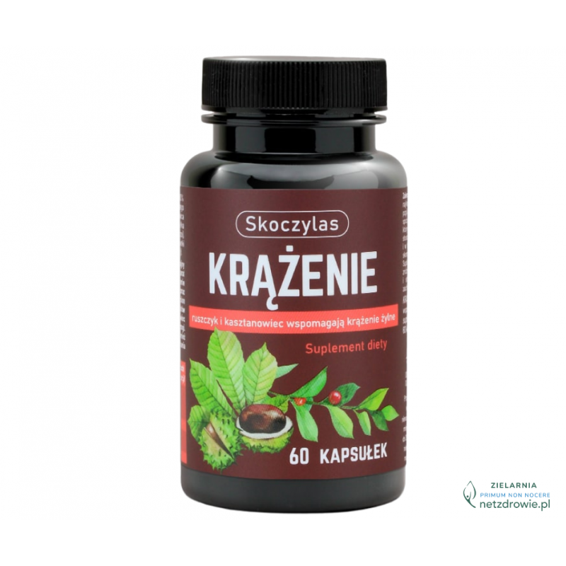 Suplement diety Krążenie marki Skoczylas to preparat przeznaczony dla osób dorosłych, wspierający prawidłowe funkcjonowanie układu krążenia. Zawiera naturalne składniki roślinne, takie jak ekstrakt z kłącza ruszczyka kolczastego, nasion kasztanowca zwyczajnego oraz pączków kwiatów goździkowca korzennego. Dzięki zawartości flawonoidów (diosminy i hesperydyny) pomaga wspomagać mikrokrążenie żylne, co może korzystnie wpływać na kondycję nóg i poprawę przepływu krwi.