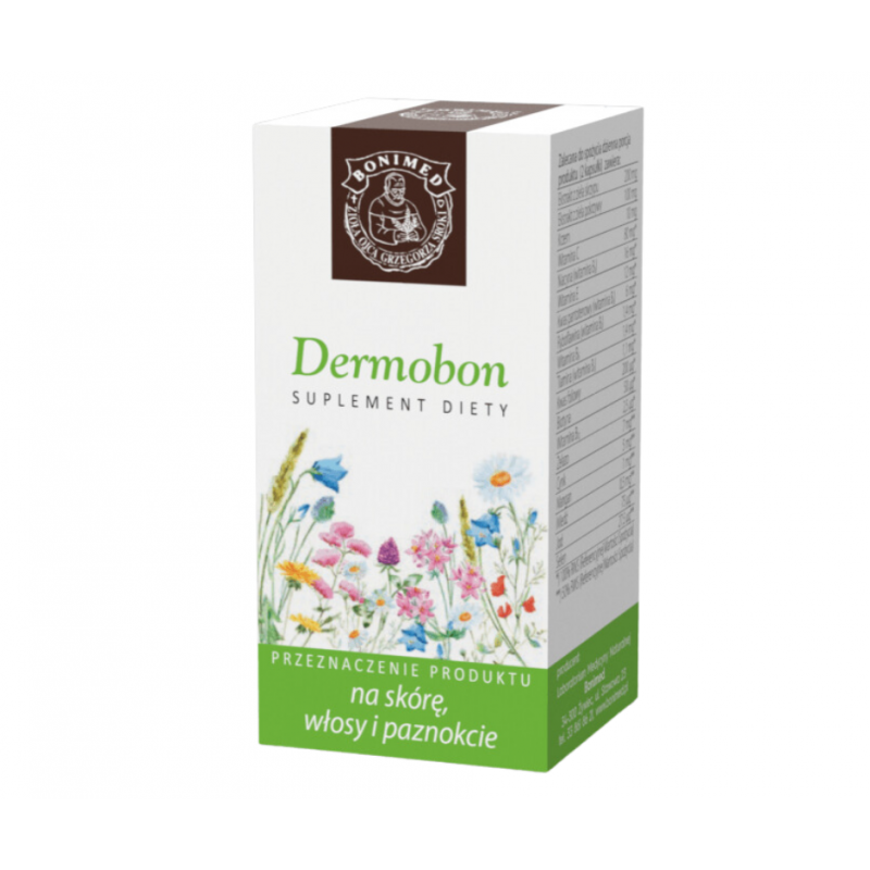 Dermobon to suplement diety marki Bonimed, który stanowi bogate źródło witamin, minerałów i ziół, wspierających zdrowie skóry, włosów i paznokci.