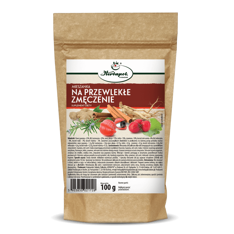 Mieszanka 9 ziół: owoc guarany, liść rozmarynu, owoc głogu, imbir, cynamon, korzeń żeń-szenia, liść miłorzębu, korzeń maki, korzeń różeńca .