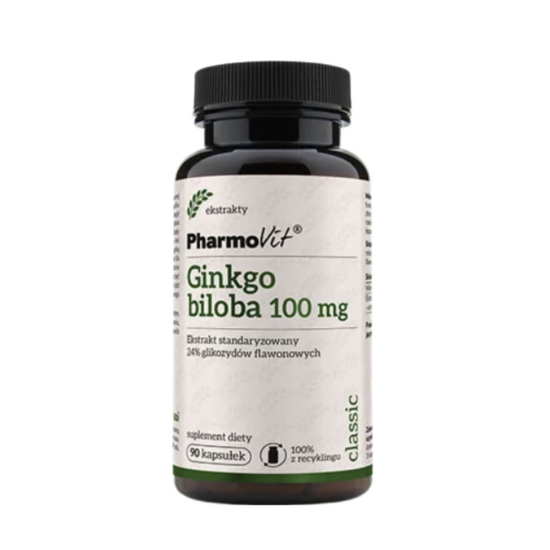 Preparat Ginko biloba 100mg standaryzowany na 24% glikozydów flawonowych marki PharmoVit w kapsułkach zawiera ekstrakt z liści miłorzębu japońskiego, znany również pod nazwą Ginkgo biloba.
