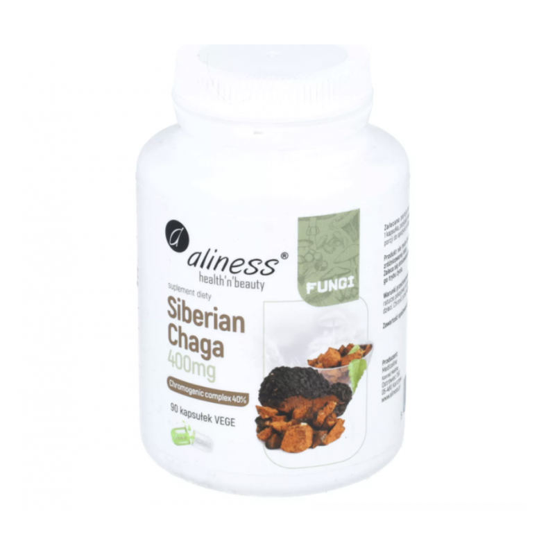 Dzięki tym cechom, Aliness Siberian Chaga 400 mg jest wyjątkowym suplementem, który może wspierać zdrowie, dostarczając cennych składników odżywczych z dziko rosnącej, czystej Chagi.