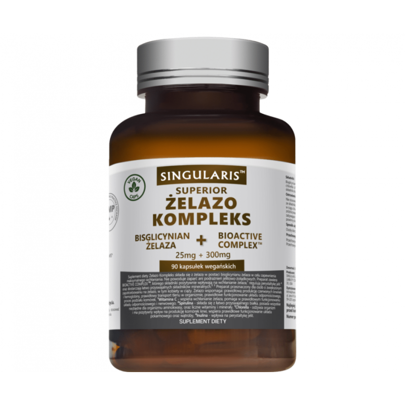 Suplement diety Singularis Żelazo Kompleks Superior zawiera żelazo w formie bisglicynianu – organicznej postaci o wysokiej biodostępności i łagodnym działaniu na przewód pokarmowy. Formuła została wzbogacona o Bioactive Complex™, który obejmuje m.in. witaminę C, spirulinę, chlorellę oraz inulinę z cykorii. Preparat może wspierać prawidłowe funkcjonowanie układu odpornościowego i produkcję czerwonych krwinek.