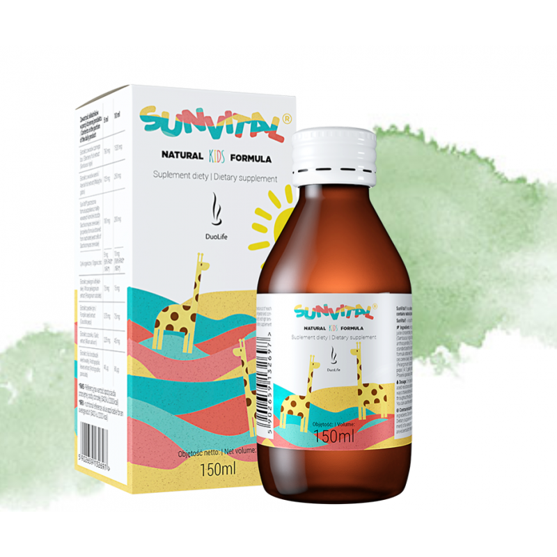 Produkt SunVital to w 100% naturalny suplement diety, przeznaczony dla dzieci powyżej 6-go roku życia. W jego skład wchodzą ekstrakty z owoców czarnego bzu, aceroli, dzikiej róży, pestek dyni, czosnku i brodziuszki wiechowatej, miód i formuła SunVital pozyskana z inaktywowanych komórek drożdży Saccharomyces cerevisiae (w tym cynk).