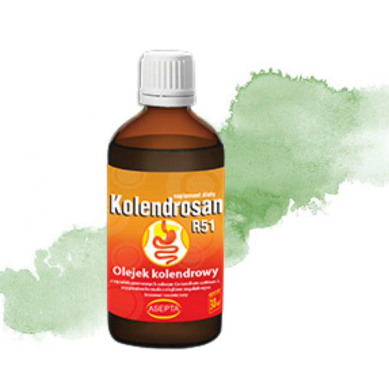Kolendrosan R51 to dobrze przyswajalny suplement diety dla dorosłych. Zawiera oliwę z oliwek, olejek kolendrowy i olejek ze słodkich migdałów. Jest to produkt naturalny, który działa już w ciągu 1 godziny, bo w odróżnieniu od tabletek i kapsułek olejek wchłania się natychmiast, nawet w ustach.