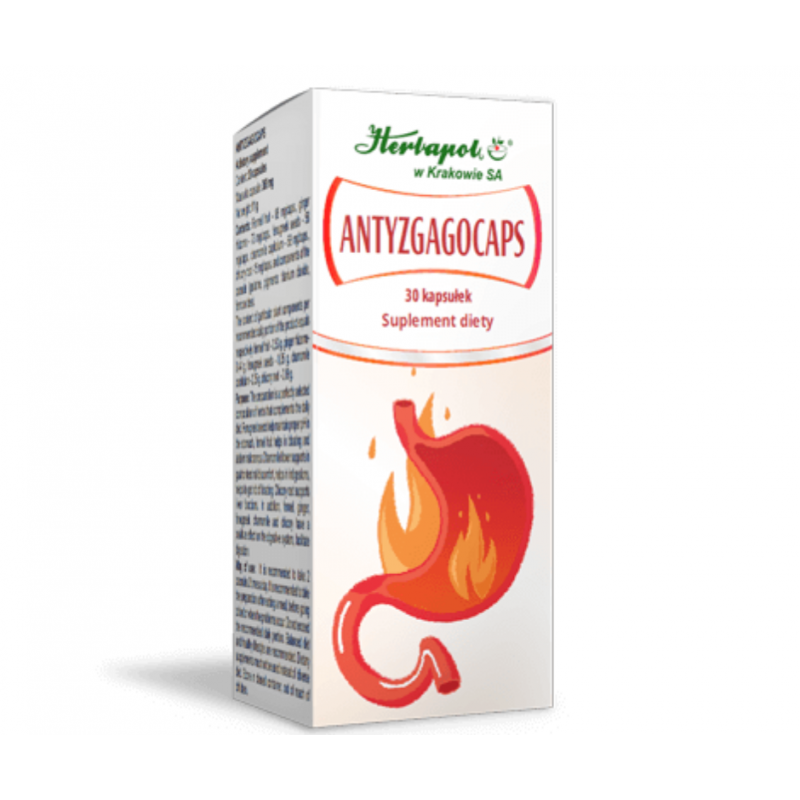 ANTYZGAGOCAPS to suplement diety dostępny w formie 30 kapsułek, oferowany przez markę Herbapol. Produkt ten został stworzony jako doskonale dobrana kompozycja ziół, mająca na celu uzupełnienie codziennej diety i wspieranie zdrowia układu pokarmowego.