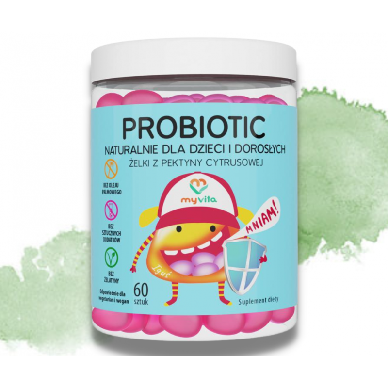 Suplement diety dla dzieci i dorosłych/ Nie zawiera żelatyny. Naturalne żelki z pektyny cytrusowej zawierające żywe kultury bakterii: Bifidobacterium lactis i Lactobacillus rhamnosus