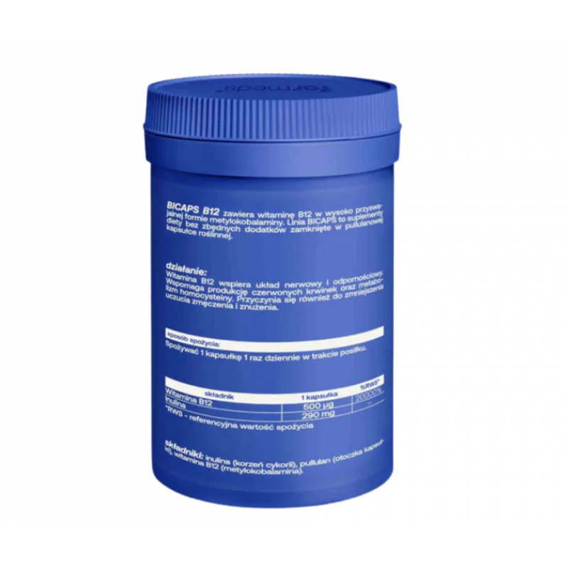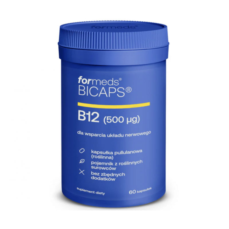 BICAPS® Witamina B12 zawiera 500 µg witaminy B12 w formie metylokobalaminy – biologicznie aktywnej i wysoko przyswajalnej postaci tej witaminy. Produkt umieszczony jest w roślinnych kapsułkach z pullulanu, bez dodatku zbędnych substancji technologicznych.