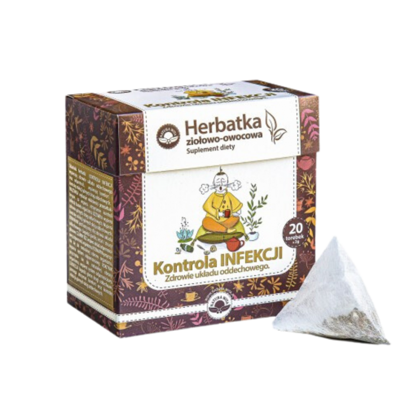 KONTROLA INFEKCJI to mieszanka, w której znajdziemy rokitnik, ziele jeżówki purpurowej, owoc i kwiat czarnego bzu, ziele krwawnika, ziele wiązówki błotnej, liść rozmarynu, kwiat dziewanny, korzeń lukrecji. Składniki te mogą mieć wpływ na zdrowie układu oddechowego.
