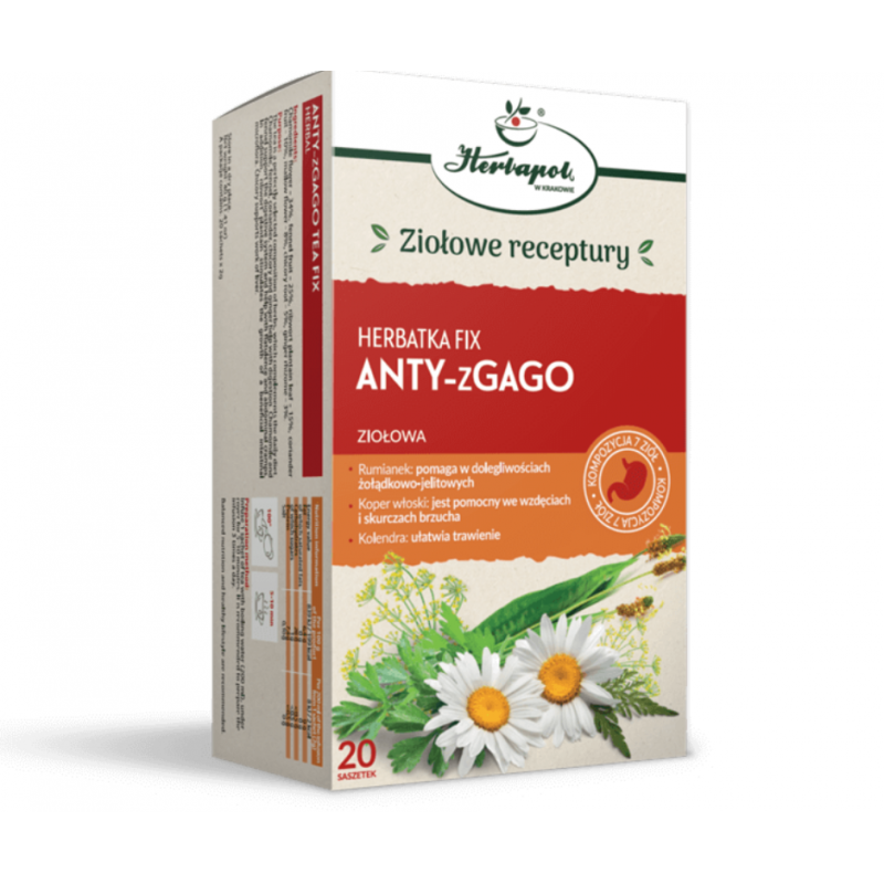 Herbatka "Fix ANTY-zGAGO" marki Herbapol to produkt z kategorii ziołowych herbat, który zawiera starannie dobraną mieszankę naturalnych składników pochodzenia roślinnego, zaprojektowaną w celu wspierania układu trawiennego i łagodzenia dolegliwości żołądkowo-jelitowych.