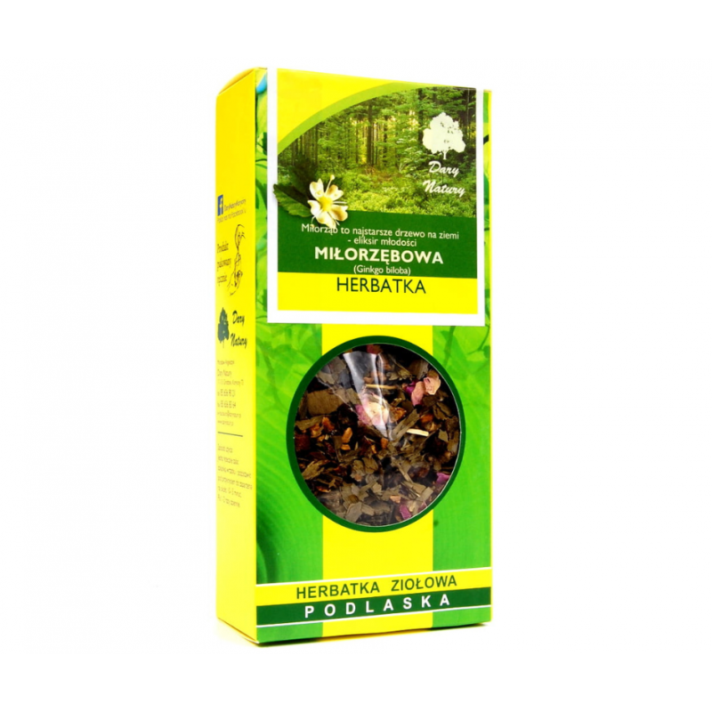 Herbata Miłorzębowa marki Dary Natury to wyjątkowy produkt, który łączy w sobie korzystne właściwości miłorzębu, głogu oraz aromatyczne dodatki płatków róży.